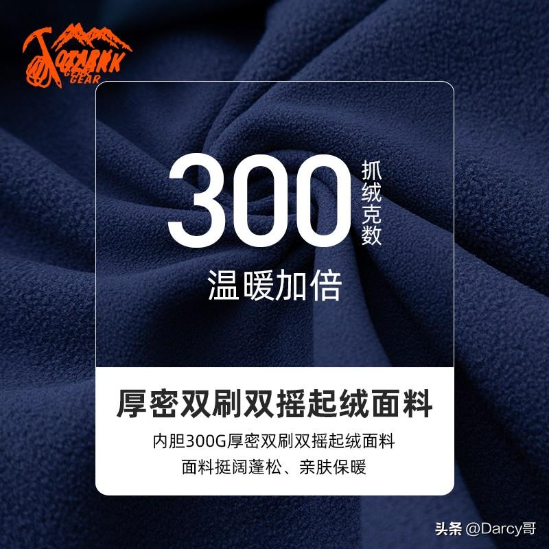 300G厚密双刷双摇起绒面料,面料挺阔,蓬松、亲肤保暖。