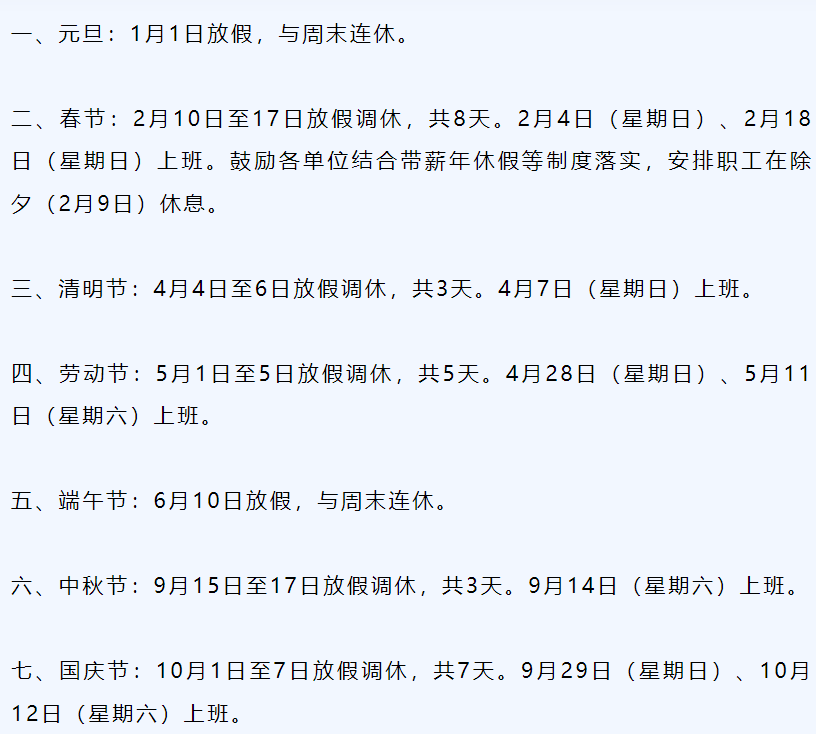 多余一些比较小的的企业,或者私人单位,那么放假往往也就3-5天,大点的企业单位都是7天假期,如果2024年你的单位领导完全响应号召,体恤员工,那么等于说你可以休息9天的事假,想一想都觉得无比开心。
