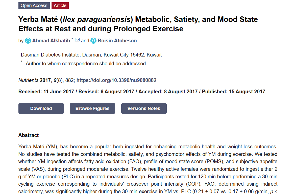 2014年的一项针对14名健康个体的研究发现,在运动前一小时服用1000毫克的马黛茶胶囊,可以在中等强度的运动中增加24%的脂肪燃烧。同样地,由于本研究样本量小,结果应谨慎对待。