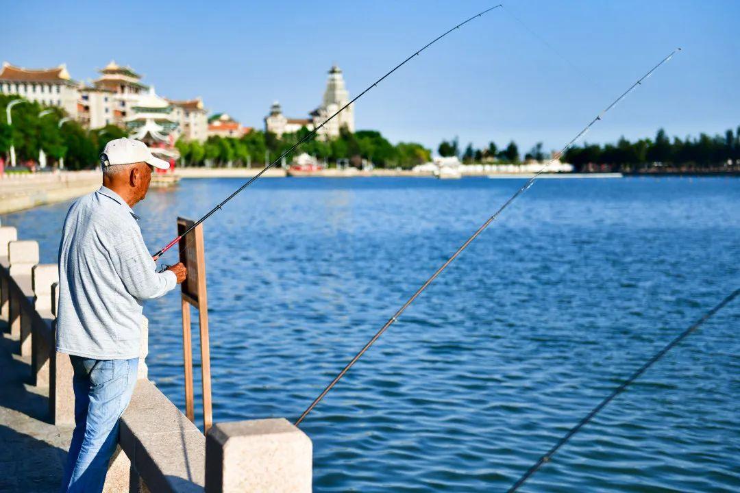 龙舟池畔的另一道风景线是在此垂钓的老人。