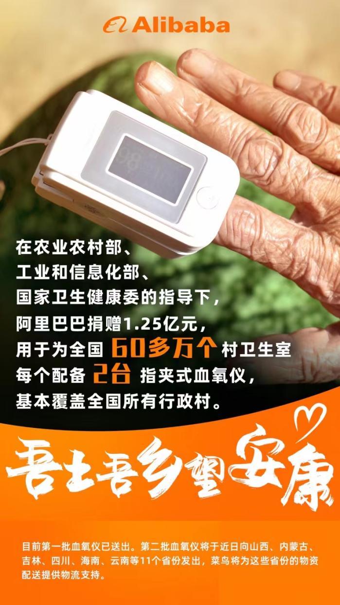 (图说:阿里巴巴宣布捐赠1.25亿,用于60多万个村配备血氧仪)