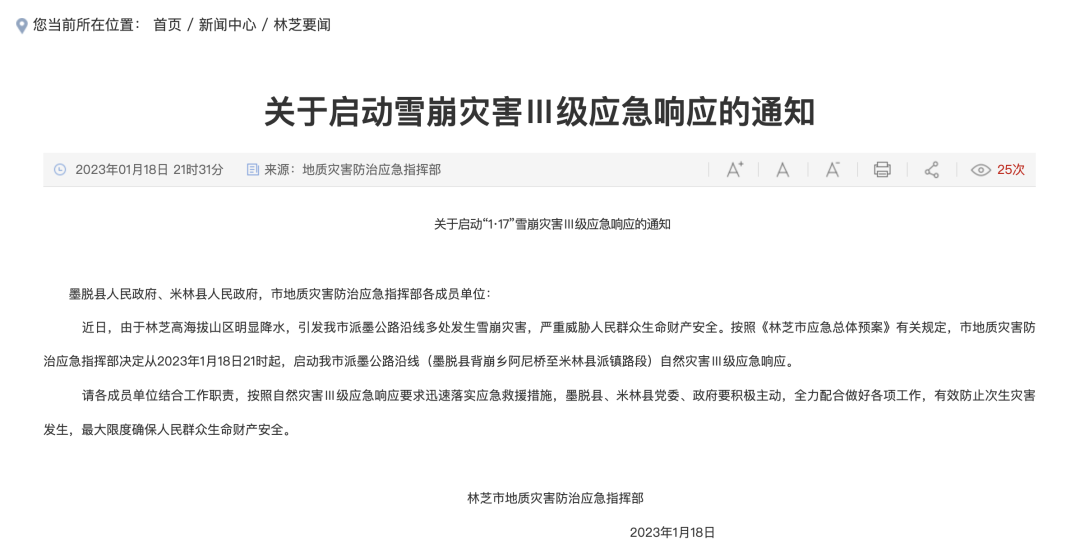 据林芝市人民政府网站1月18日消息,近日,由于林芝高海拔山区明显降水,引发林芝市派墨公路沿线多处发生雪崩灾害,严重威胁人民群众生命财产安全。按照《林芝市应急总体预案》有关规定,市地质灾害防治应急指挥部决定从2023年1月18日21时起,启动林芝市派墨公路沿线(墨脱县背崩乡阿尼桥至米林县派镇路段)自然灾害Ⅲ级应急响应。