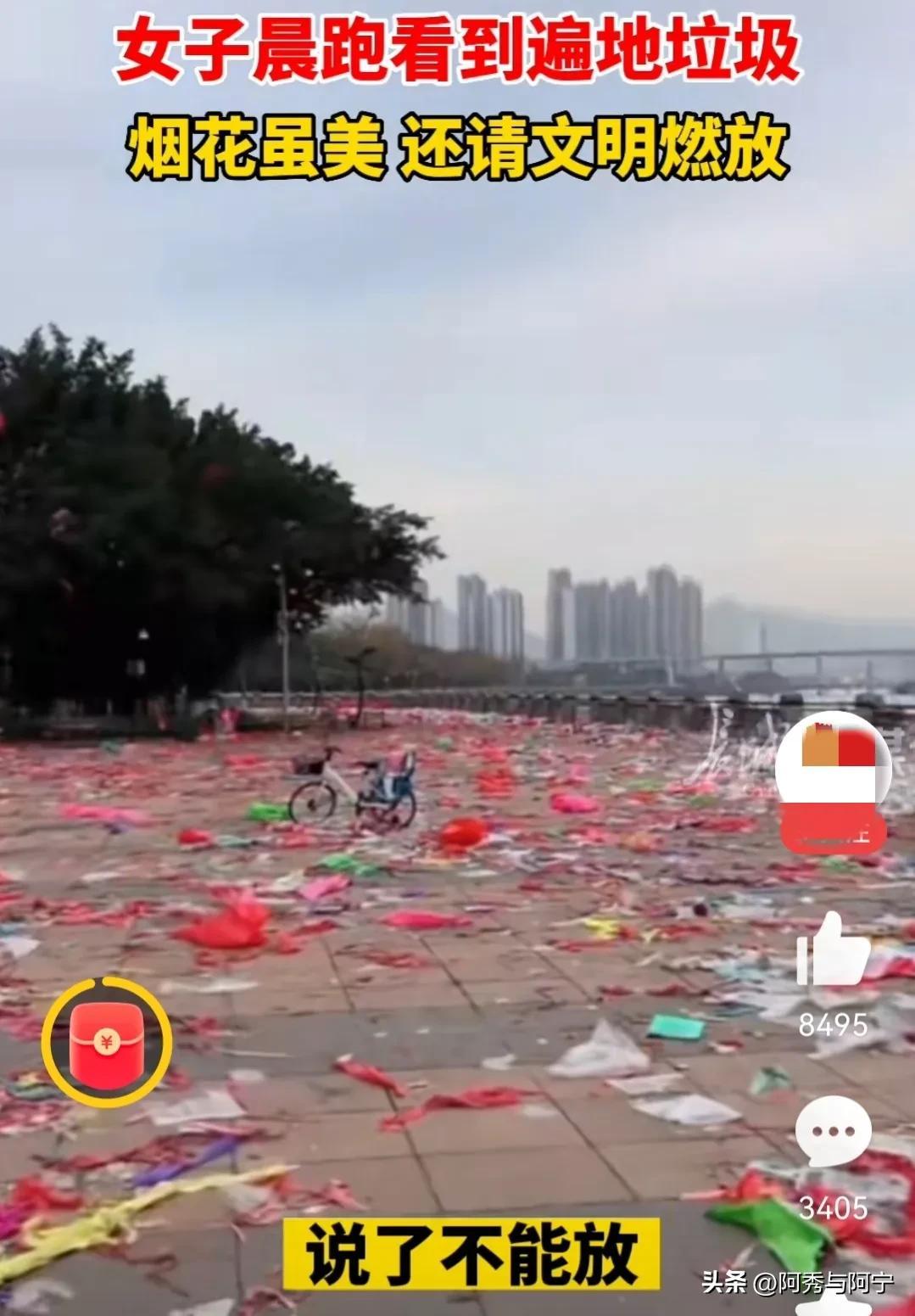 另有网友爆料了,自己在晨跑时,看到的场景。河滨公园的小广场上,铺满了五颜六色的纸屑,全是烟花燃放后的垃圾。几位环卫工人,正在辛勤地打扫。